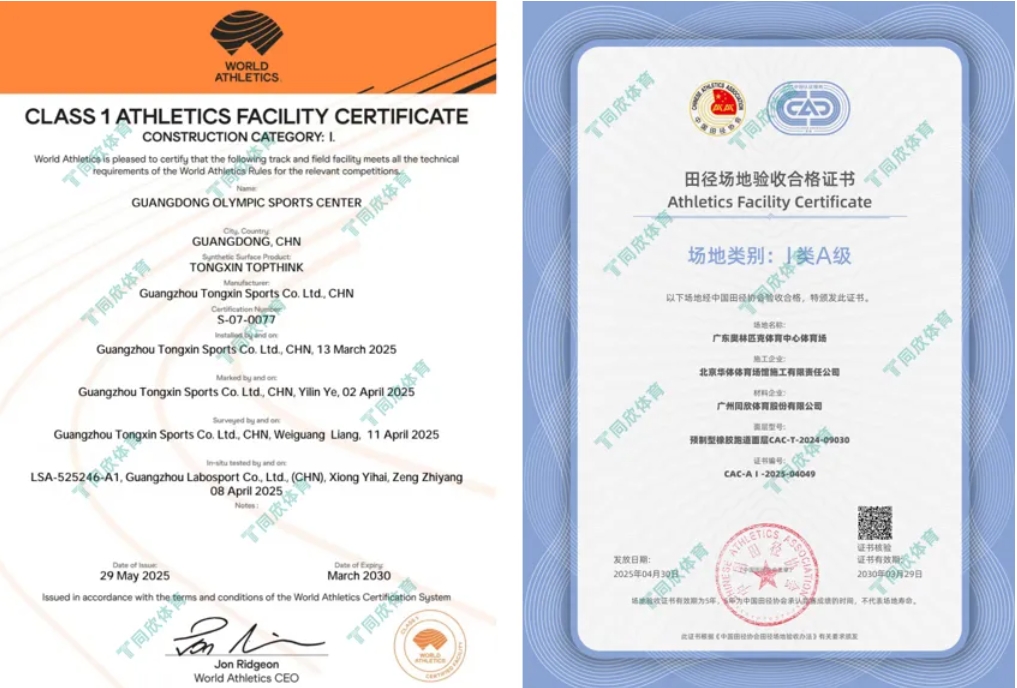 均將獲得世界田聯一級場地認證