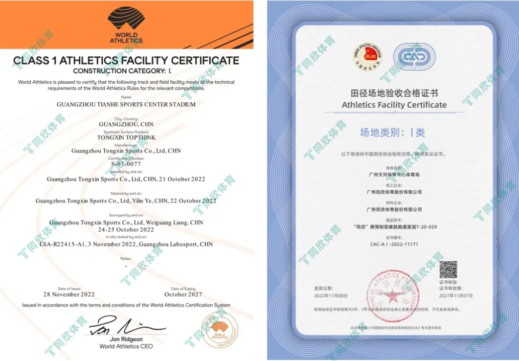 圖丨廣州天河體育中心-“雙一級”場地認證證書
